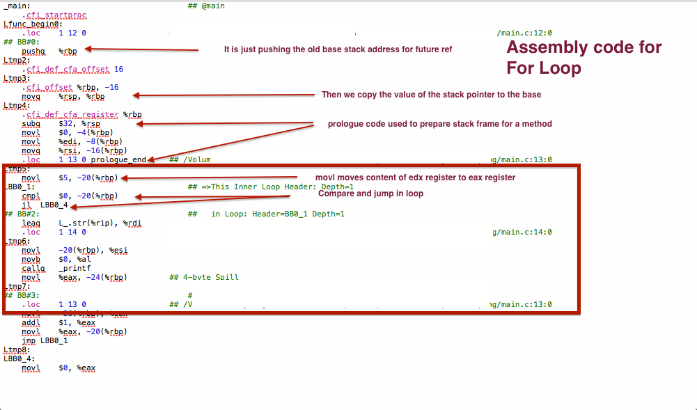 Instead of explaining it in text, I am posting screenshot of assembly code generated with marking of details. The assembly code is generated in Mac OS X , XCode by using Assemble option.
