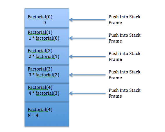 When factorial(n) will be called every time , a stack frame will be created and the call will be pushed to stack, the entire call stack looks like below. The below image shows stack operations for a given recursive call.